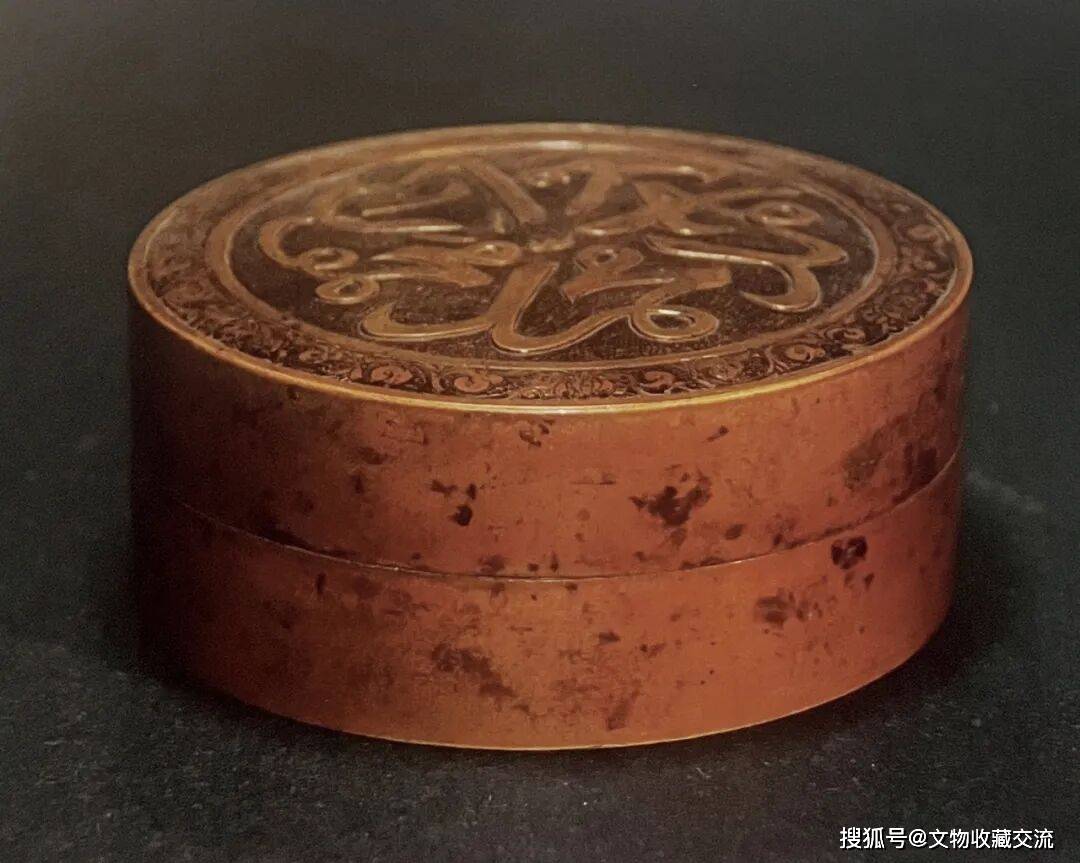 此件正德时期的阿拉伯文香盒即为其中之上品,以精铜铸就,铜质精炼,入手生坠,局部露铜,观之若金。更为难得之处,通体皮色上佳,红皮宁静匀透,似朝霞之初现,包浆厚泽沉稳,若美玉之莹润,由此亦可证:红皮之器,有明一代以正德朝为最佳。