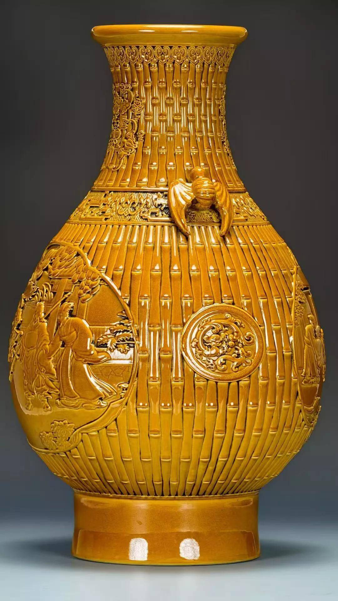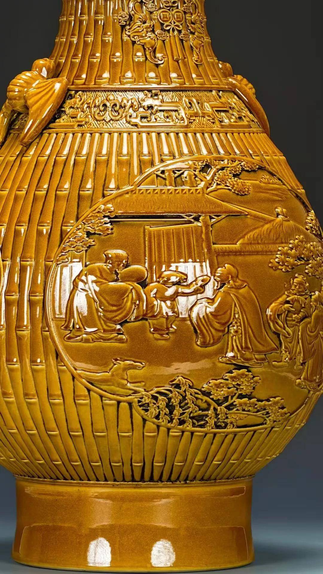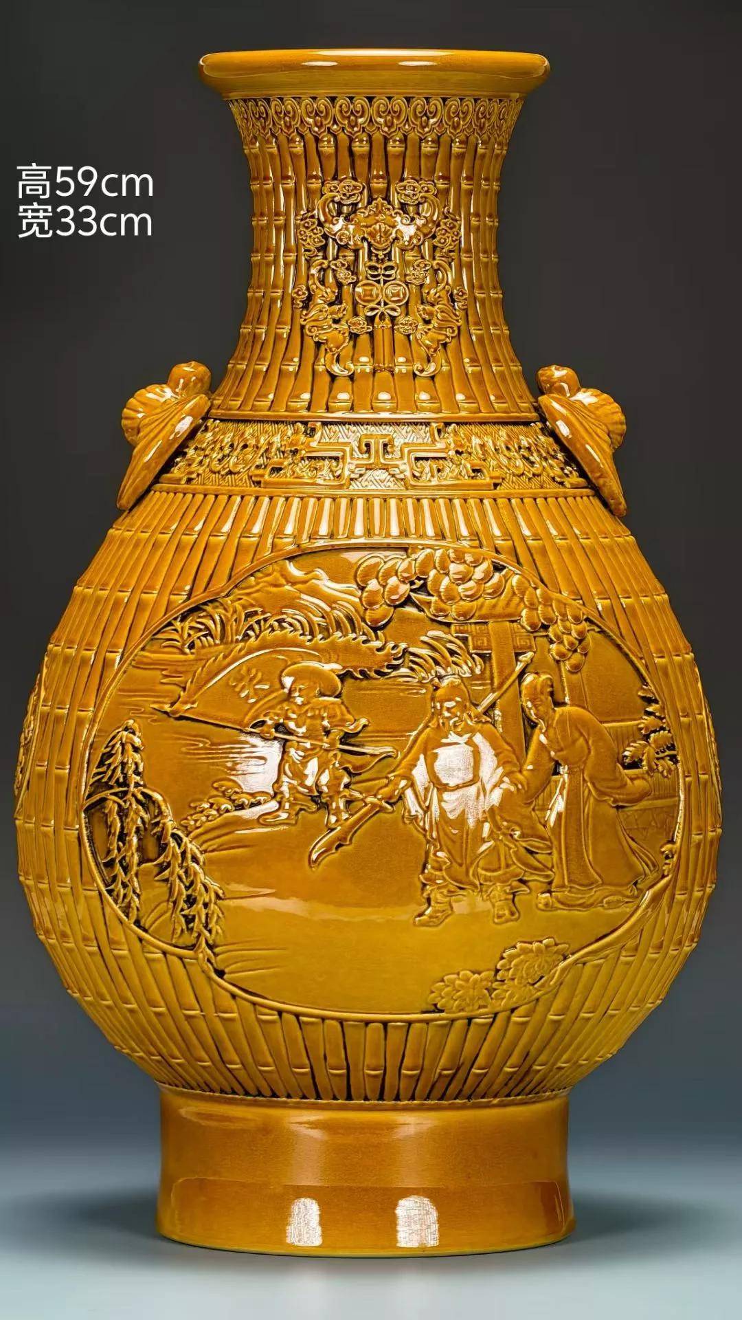 黄釉高浮雕刻:三顾茅庐纹梅瓶 在中国古代陶瓷艺术的瑰丽宝库中,明清时期的黄釉瓷器以其独特的皇家气质与精湛工艺占据着璀璨的一席。黄釉梅瓶更是其中尤为珍贵的品类,以其端庄秀雅的造型、明丽尊贵的釉色与寓意深厚的纹饰,成为宫廷御用瓷器的典范。今日所见这件“黄釉浮雕三顾茅庐纹梅瓶”,高59厘米,宽33厘米,器型挺拔,雕工精湛,釉色莹润,堪称一件融合了皇家规制、工艺美学与文化象征的重器。
