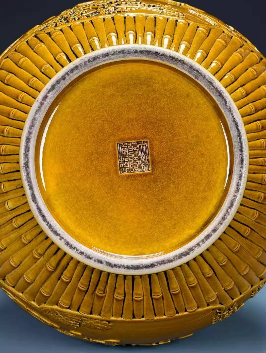 四、艺术价值:宫廷美学的凝练表达 此瓶不仅是一件实用器或陈设器,更是清代宫廷审美理念的集中体现: 造型典雅:梅瓶之秀与黄釉之贵相得益彰; 装饰精湛:浮雕与釉色结合,富丽中见秩序; 文化符号:每一处纹样与色彩皆承载礼制与信仰,是“器以载道”的典型范例。 五、收藏价值与市场潜力 1. 稀缺性 黄釉御瓷本就存世稀少,如本品般体量硕大、品相完好、雕工精湛者,更是凤毛麟角,堪称“博物馆级”珍品。 2. 帝王印记 作为官窑御制瓷器,其背后是清代最顶尖的工匠体系与审美标准,具有不可复制的“品牌价值”。 3. 资产属性 在艺术品市场中,明清官窑黄釉瓷一直是“硬通货”,抗跌性强,保值增值潜力稳定,尤其受高净值藏家青睐。 4. 趋势看好 随着中国古代艺术品在全球市场中认同度的不断提升,此类兼具历史、艺术与皇家身份的精品,必将成为藏界竞逐的焦点,未来价值难以估量。 结语 这件黄釉浮雕三顾茅庐纹梅瓶,不仅是陶瓷工艺的杰作,更是中国宫廷文化与盛世气象的物质载体。它凝聚了明清官窑的技艺精华,承载了皇家的礼仪意志与美学理想,其价值远非金钱所能衡量。对于博物馆与收藏家而言,拥有这样一件作品,即是对一段辉煌历史与艺术传奇的珍藏与传承。