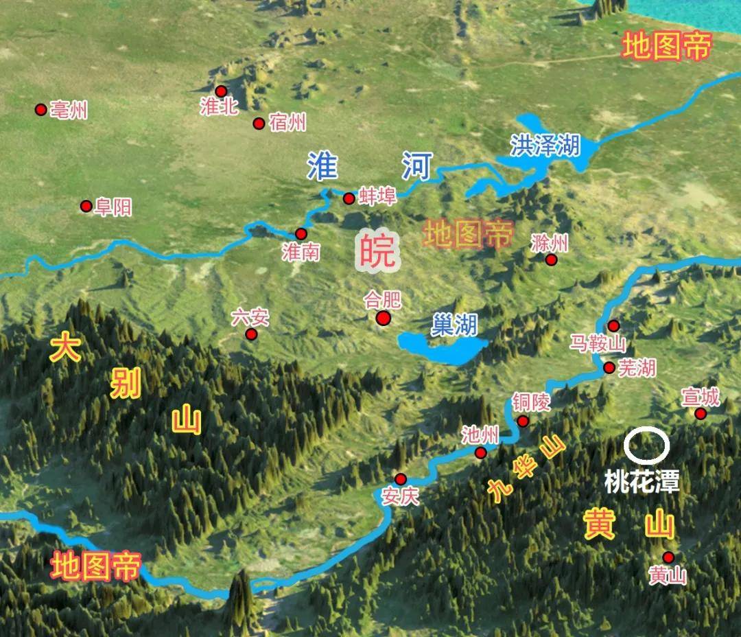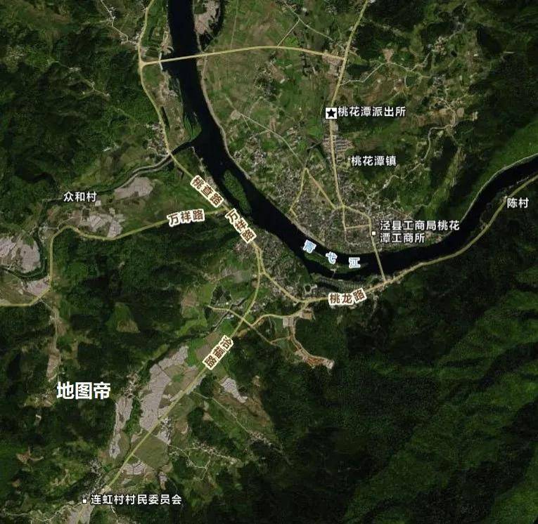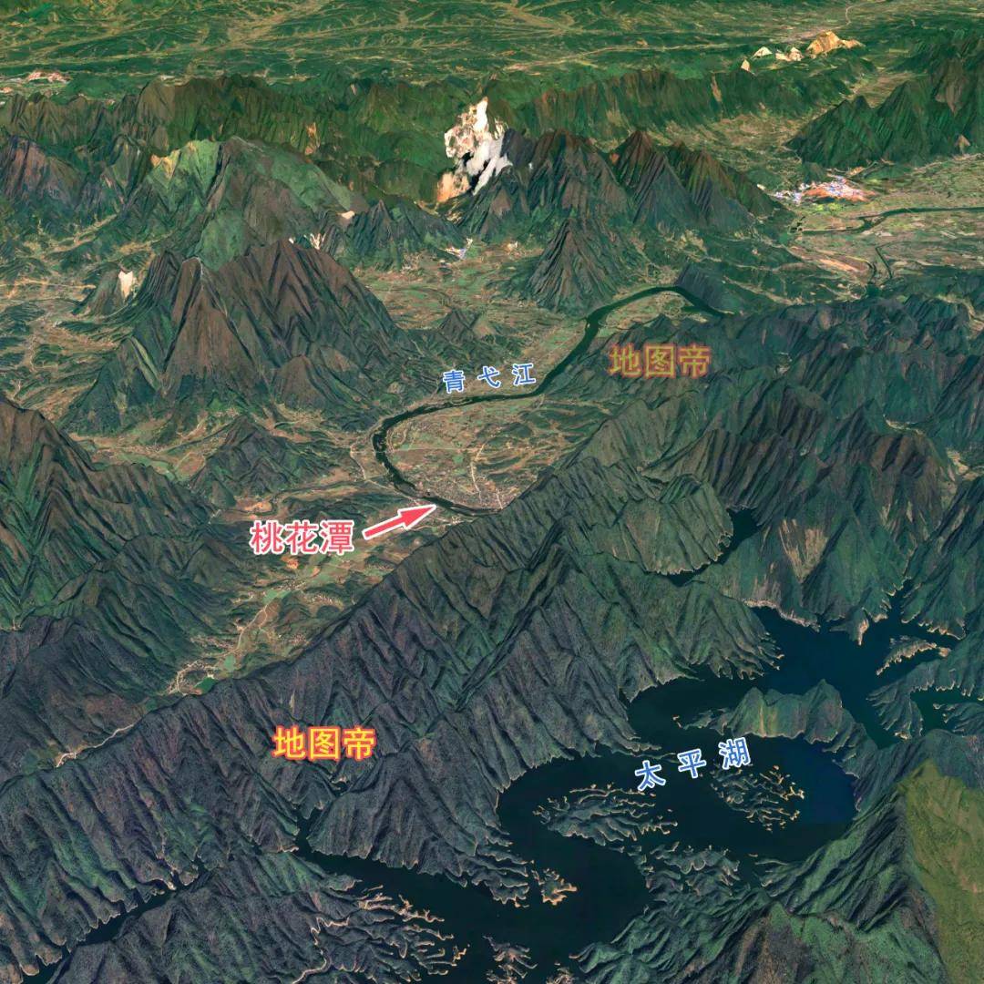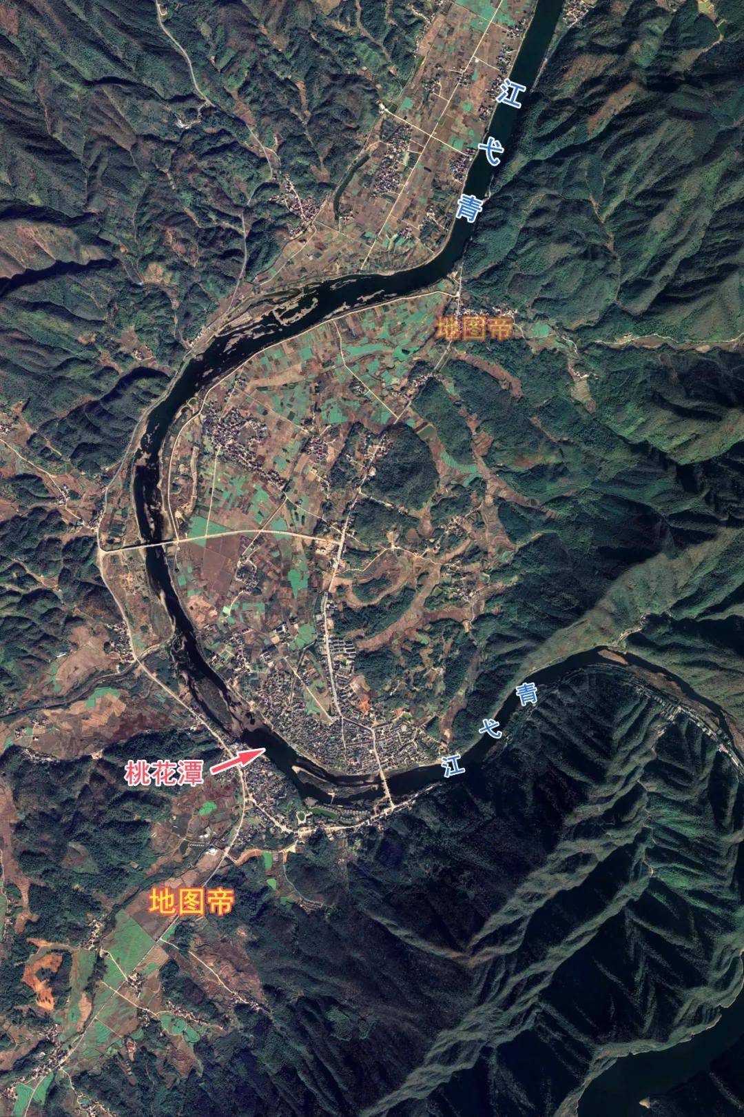 桃花潭,长江支流青弋[yì]江上游的一段,位于安徽宣城泾县以西40千米桃花潭镇翟、万二村之间,南临黄山、西接九华山,与太平湖相连。青弋江这一段,十数里夹岸无杂树,而桃林缤纷,芳飞红雨,故称桃花潭。