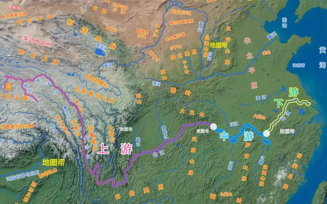 长江长约6397千米,居世界第三位,次于非洲的尼罗河和南美洲的亚马逊河。长江干流流经青海、西藏、四川、云南、重庆、湖北、湖南、江西、安徽、江苏、上海11个省、自治区、直辖市,于崇明岛以东注入东海。