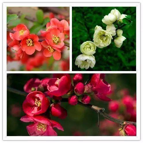 贴梗海棠,因为花梗短粗或接近无梗而得名。花朵颜色有粉色、朱红色、白色,花期为每年的3-5月。
