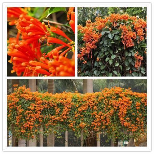 炮仗花,别名黄鳝藤,多植于庭园建筑物的四周,攀援于凉棚上,因其红橙色的花朵累累成串,状如鞭炮,故有炮仗花之称。