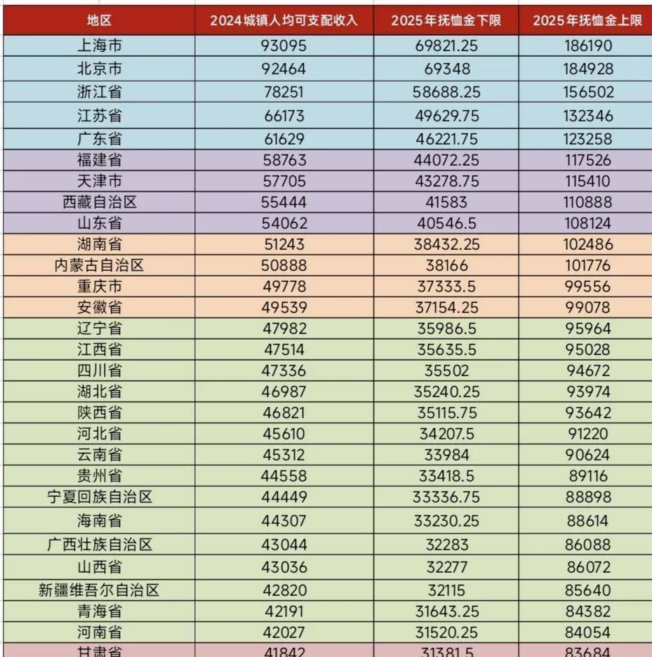 企业退休人员的丧葬抚恤金包括丧葬补助金和一次性抚恤金,两者均与参保省份的上一年度城镇居民月人均可支配收入直接挂钩。 2025年,各地标准随2024年居民收入数据同步上调。