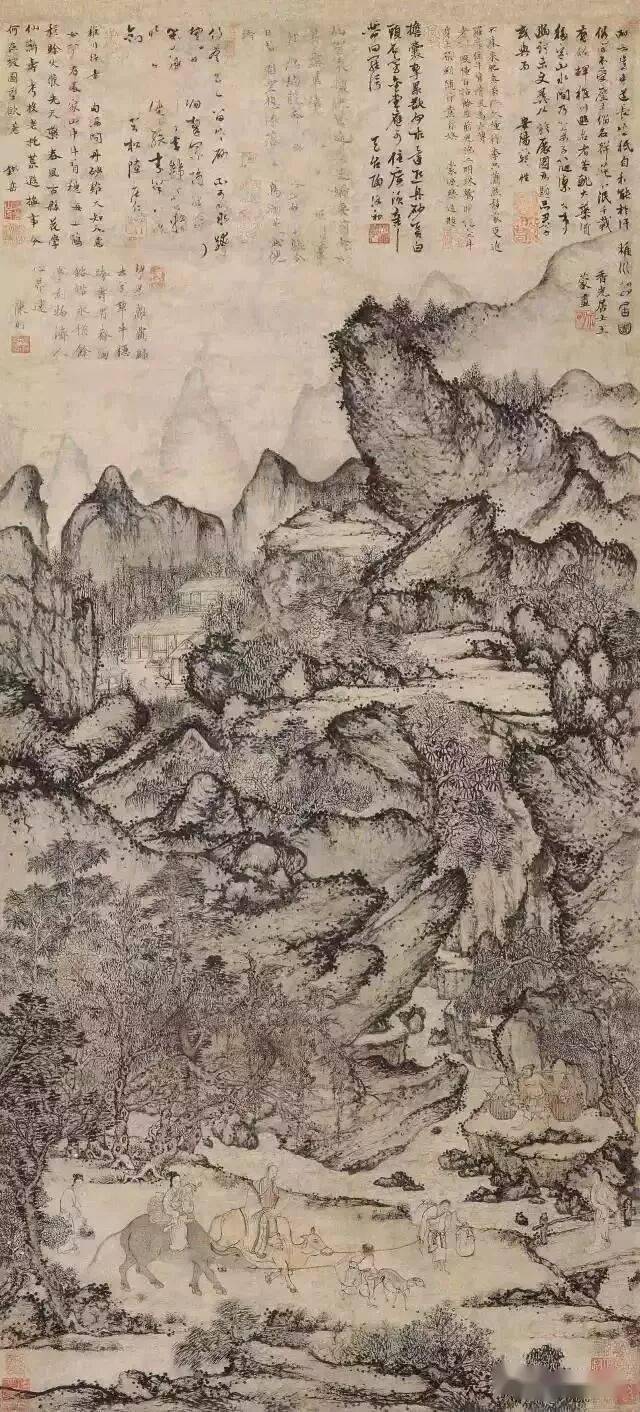 《稚川移居图》描绘了东晋葛洪携带家眷移居罗浮山,修道炼丹的故事。画上有与王蒙同时或稍后的七位大学者、大画家或大诗人如韩性、倪瓒、陶复初、陈则等人的题诗。此外,《稚川移居图》上还有明代大收藏家项元汴近20余枚收藏印,极为珍罕难得。