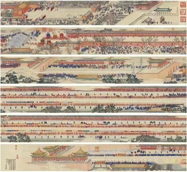 《乾隆大阅图》是清代宫廷画家郎世宁晚期作品。第四卷《行阵》是一卷长24米、宽69厘米的巨幅绢本设色手卷,图中所绘人物多达9000个,虽不及半截指长,却面貌分明、神情宛然,所绘衣饰、车马枪炮、仪仗旗鼓等十分精细。