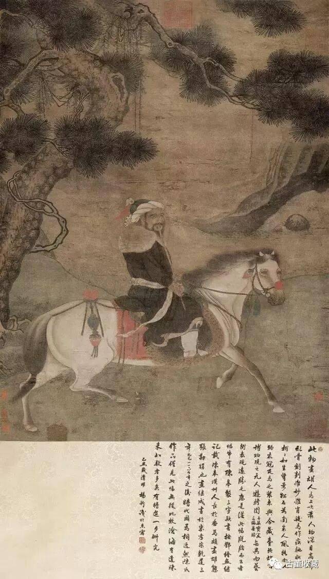 这是目前存世的陈皋的唯一作品。图绘一蕃人骑马吹萧过漠地古松下,于画面左侧中部,题有楷书“陈皋制”三字,墨色沉着,深入肌理,与画面用墨统一,显系原画本款。