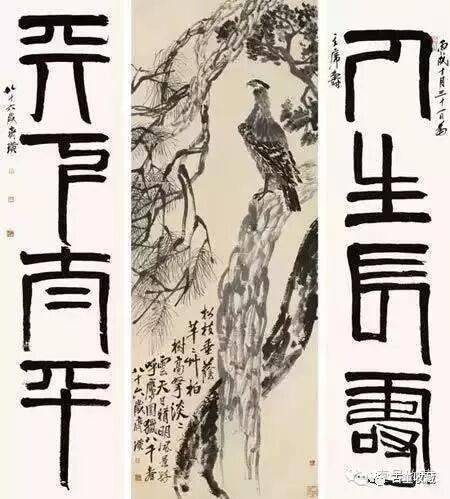 画面气势宏伟,有松柏围英之喻;篆书四言联,则浑厚自然、端庄大气,且文意极佳:“人生长寿,天下太平”,堪称齐白石书画之绝精神品。