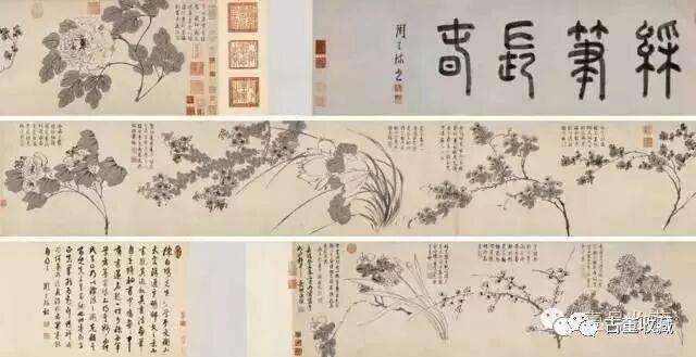 陈栝《情韵墨花》是乾隆十分喜爱的明代作品,乾隆自书诗十首,前后钤盖印章三十余方,可见珍爱至极。陈栝为明代花鸟画宗师陈淳之子。