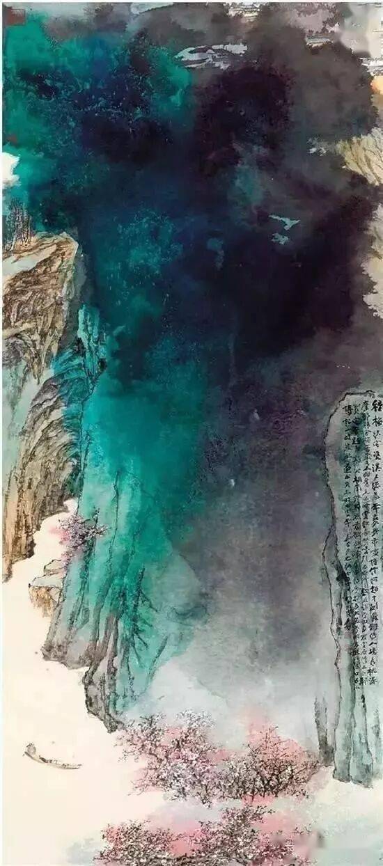 全幅高约七尺,上方几近满画,以极厚重的石青石绿等矿物颜料,反复泼洒,层层堆叠。从该画中可看出大千泼墨和泼彩的结合可谓驾轻就熟、炉火纯青。画面下方留白,近岸处醒以桃花数丛,嫣红粉嫩,烂漫怒放,清香袭人,旁有渔翁钓艇,似入桃源之境,这样的景象也是张大千毕生所求。