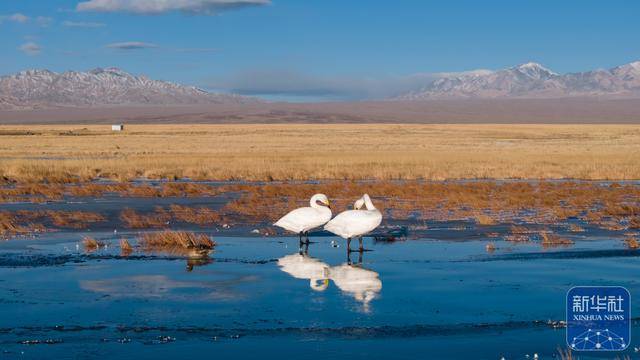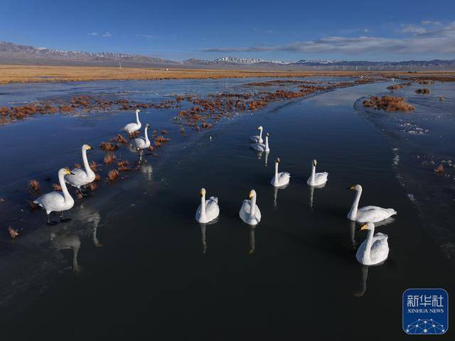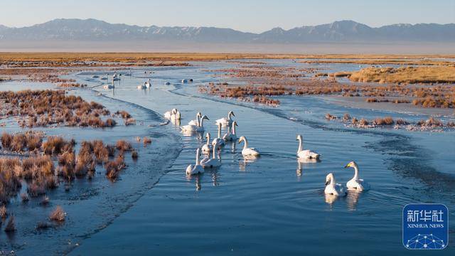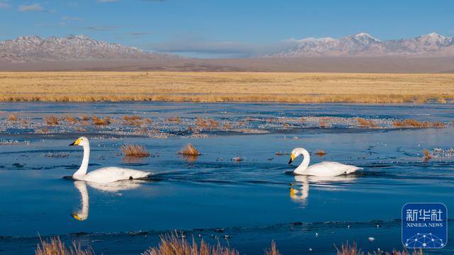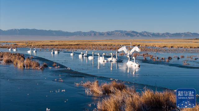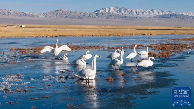 近日,位于甘肃省酒泉市阿克塞哈萨克族自治县的小苏干湖湿地逐渐进入封冻期。在尚未完全结冰的水域,成群的大天鹅游弋觅食。它们洁白的身姿与澄澈的冰湖、金黄的草原以及远处皑皑雪山相映成趣,构成动人的冬日湿地生态画卷。
