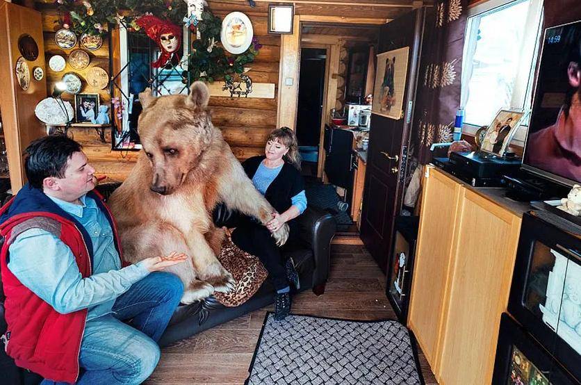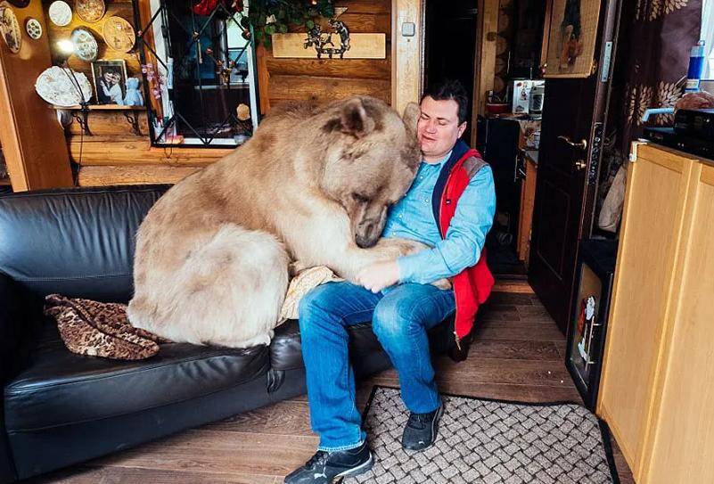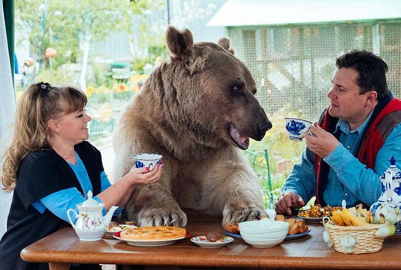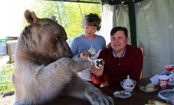 更神奇的是,斯捷潘除了看起来是棕熊,几乎已经没有熊样了。它从来没有表现出攻击性,无论是对主人还是其他人类;它每天都会在院子里踢足球玩,跟主人玩摔跤,累了就随地大小睡;还会和主人一起喝茶。