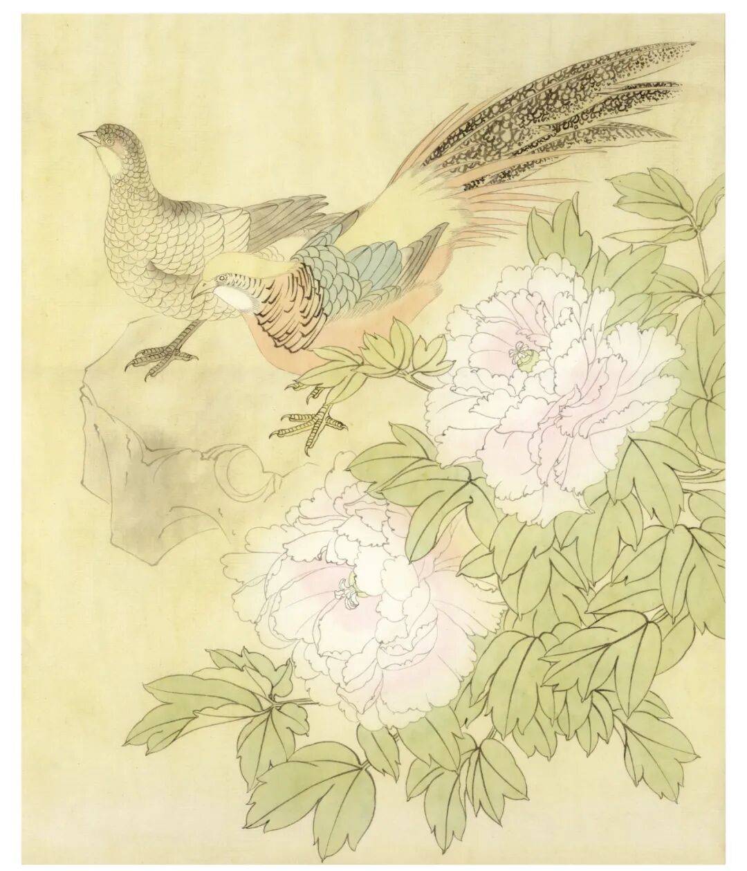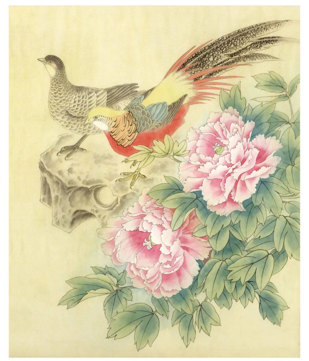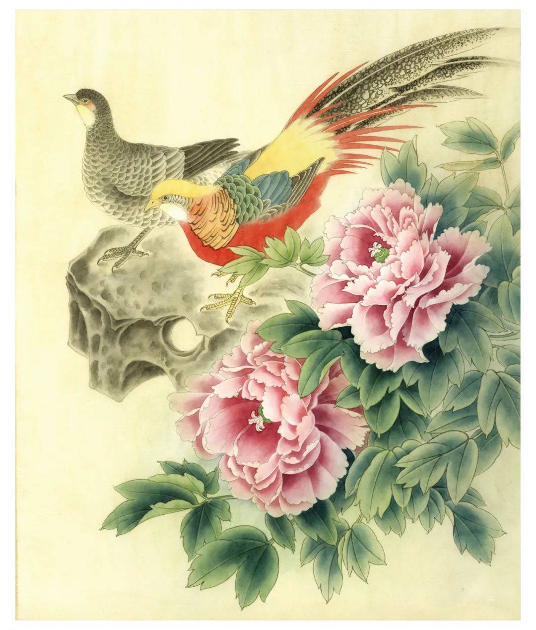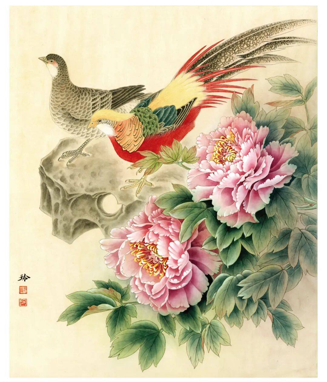 整理是最后的完成部分,花头用白粉提高光,浓粉黄点蕊,浓白粉勾丝,点花蕊的时候需要细心。叶子用墨青色勾勒出叶脉,部分叶子倒染四绿。萼片、嫩叶倒染朱磦,反叶和萼片用胭脂勾叶脉。石头暗面统染淡花青墨,亮面统染淡焦茶。深入刻画红腹锦鸡,丝毛,点睛,提画细节,锦鸡腹部用大红加 少量墨单笔丝毛,头部羽冠用藤黄加钛白丝毛,蓝色部分羽毛用花青墨丝毛,黑色羽毛部分用重墨丝毛 ,尾羽罩染焦茶,白粉提亮边缘。鸟喙罩染淡藤黄,爪子用浓粉黄勾填。雌鸟背部部分羽毛用重墨画出纹理,暗处和头部用焦茶罩染,爪子用白粉勾填。最后整体观察,整体细节再局部调整,该统染的统染 ,加深的加深,该提亮的提亮,要注意整个画面的协调性和观赏性。题字,铃印完成。
