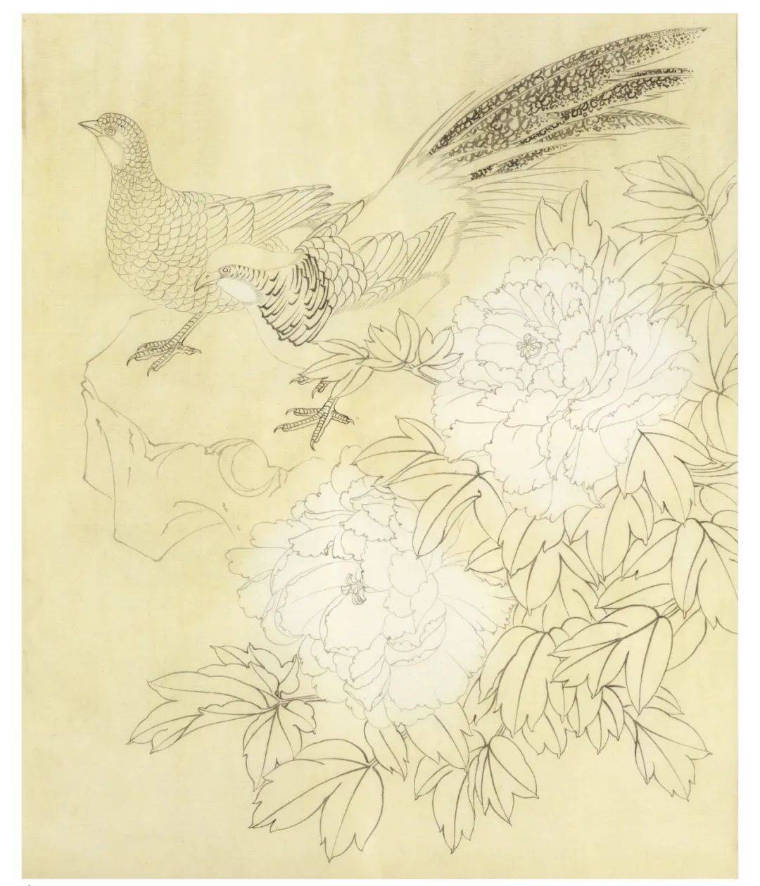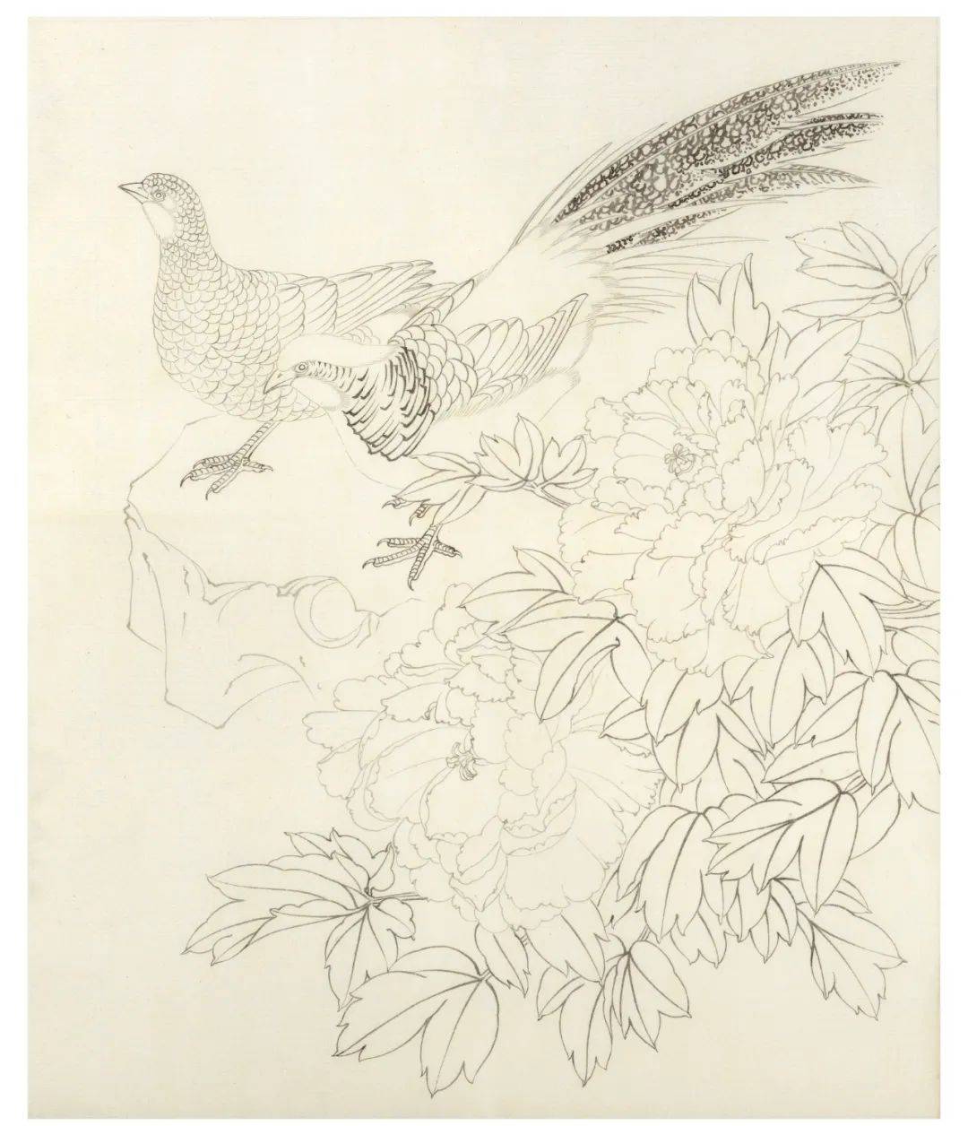 勾线,前面的叶子用中墨勾勒,后面的叶子用淡墨勾勒,花头用淡墨勾勒,注意近实远虚。石头用淡墨勾勒。锦鸡:用重墨勾红腹锦鸡尾部的羽毛、羽冠、爪子和鸟喙,尾羽较长,先勾出外轮廓,然后再用重墨勾出黑白相间的云状斑纹,不要太规则,要自然。中墨偏淡墨勾眼、颈、胸、腹、背。整体前 景的物体都要比后景的物体墨色要重。(为方便观赏,此处用重墨印出。)