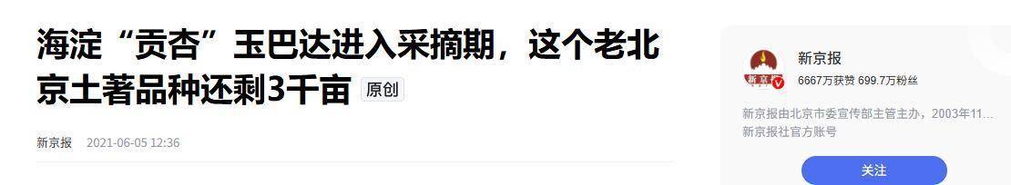 信息来源:新京报 海淀“贡杏”玉巴达进入采摘期,这个老北京土著品种还剩3千亩 2021-06-05