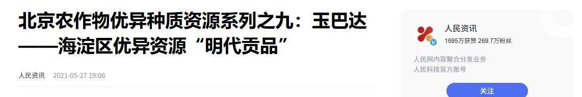 信息来源:人民资讯 北京农作物优异种质资源系列之九:玉巴达——海淀区优异资源“明代贡品” 2021-05-27