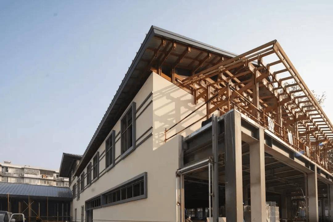 古色古香的造型、米黄色的外壁、竹木结构的檐廊、雕花窗……周处读书台北侧,两栋配套建筑主体已封顶。项目将现代设计理念与传统建筑风貌巧妙融合,打造出别具一格的坡屋面顶造型,仿若摊开的书卷,在形态上与古迹产生新旧碰撞,时光交叠之美。