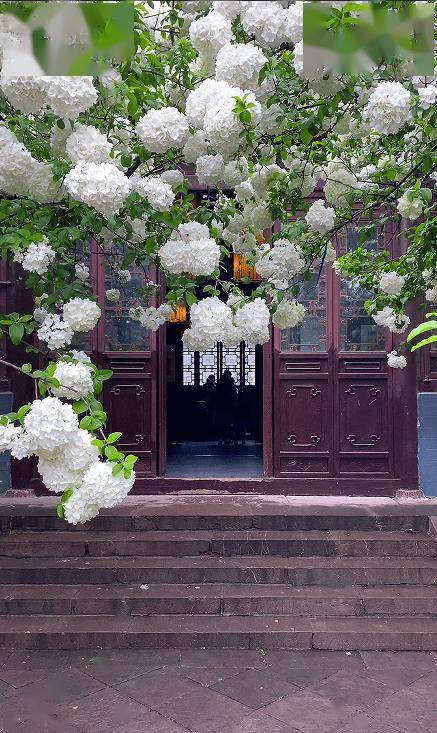 满树洁白的木绣球花一簇簇如同白云朵朵悬在枝头,与黛瓦朱梁形成天然画框,随手一拍就是“大片”。