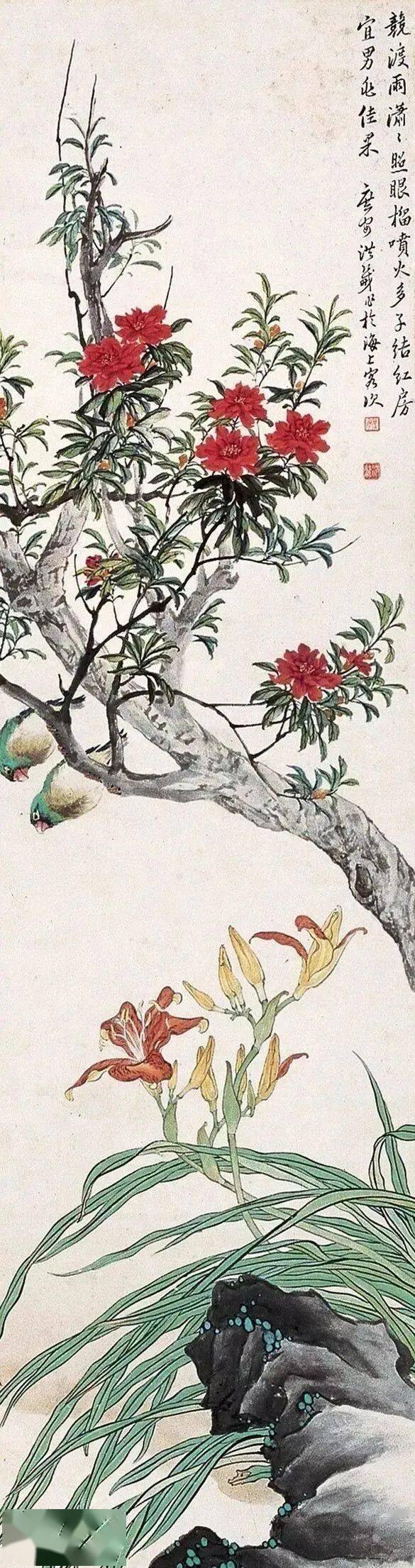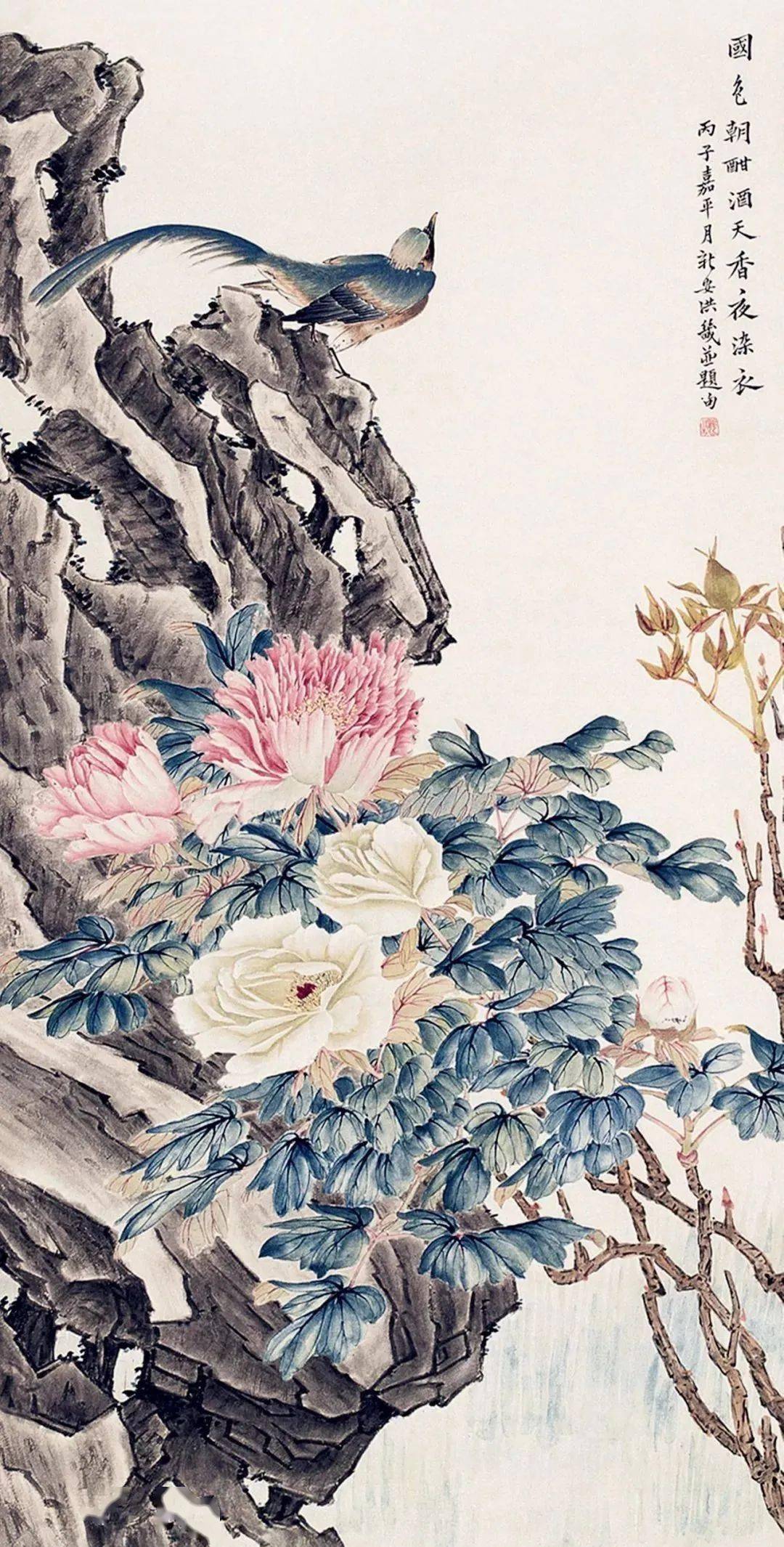 洪庶安以画花鸟为主,时人称他“宗宋元院本,勾勒写生,渲染赋色诸法,出入清初南田南苹间,妍艳淡冶,各臻其胜。”基本概括了其作品的风格特征。以其存世的作品看,大多是花鸟题材,以重彩居多,这大概便是当时人所说的“宗宋元院本”及“出入清初南田南苹间”。