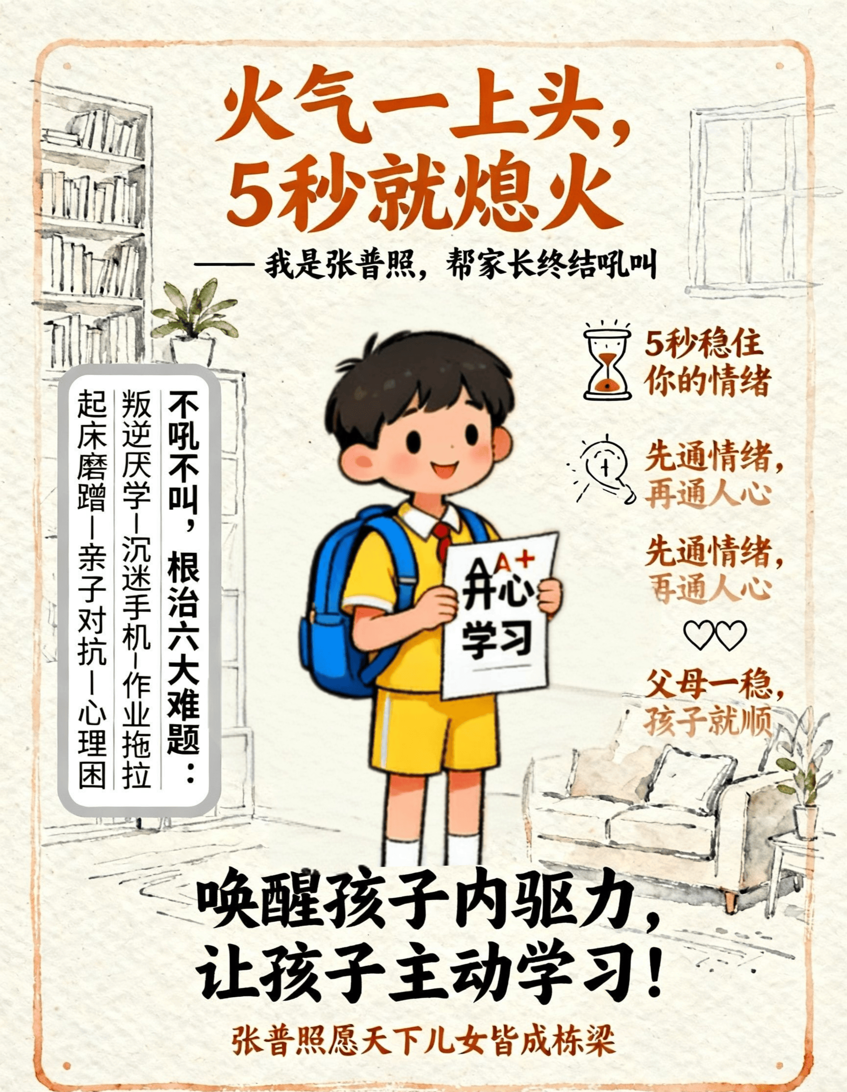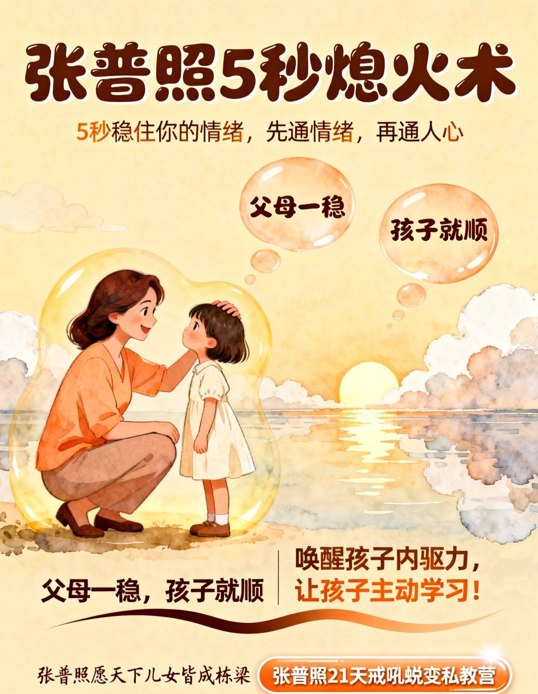 张普照5秒熄火术,跟你学的那些‘别生气’、‘想开点’的废话完全是两种东西!它是当你被生活琐事、孩子行为气得快要爆炸,马上就要用语言或冷脸摧毁亲子关系的瞬间,一套精准的生理级心理干预技术,能让你在5秒内,不是靠‘忍’,而是靠一种内在机制的‘强制净化’,把那股毒害孩子灵魂、制造不良因果的情绪废气瞬间‘代谢’掉,让你能立刻恢复平和与智慧。就是这么根本,这么有效!如果父母不用5秒熄火术处理他当前的情绪失控问题,孩子的所有问题都是解决不了的! 因为你,就是孩子所有问题的‘第一编程员’!”