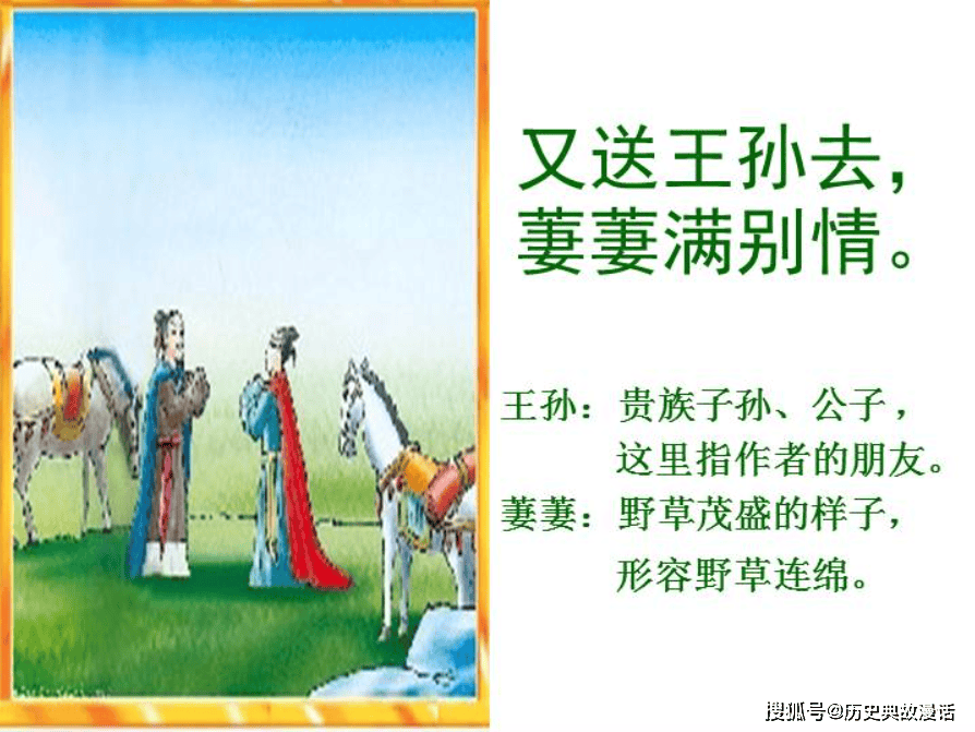 首先看诗题,意为这首诗是“赋得体”的“古原草送别”。所谓“赋得体”,是科举时代一种按来源分类的诗体,专指在乡试与会试之间的试帖考试时,给士子的应试命题,题前必须冠“赋得”二字,所以写成的诗叫“赋得体诗”。这种应试命题,就是借前人成句或成语来写诗,类似现在的命题作文,它受到各种限制,很难写好。但白居易这首命题诗,却紧扣诗题,抓住“古原、草、送别”三个意象,连缀成“在长满野草的古老原野上送别朋友”的意群,滴水不漏地概括了题意,从而总领全诗。