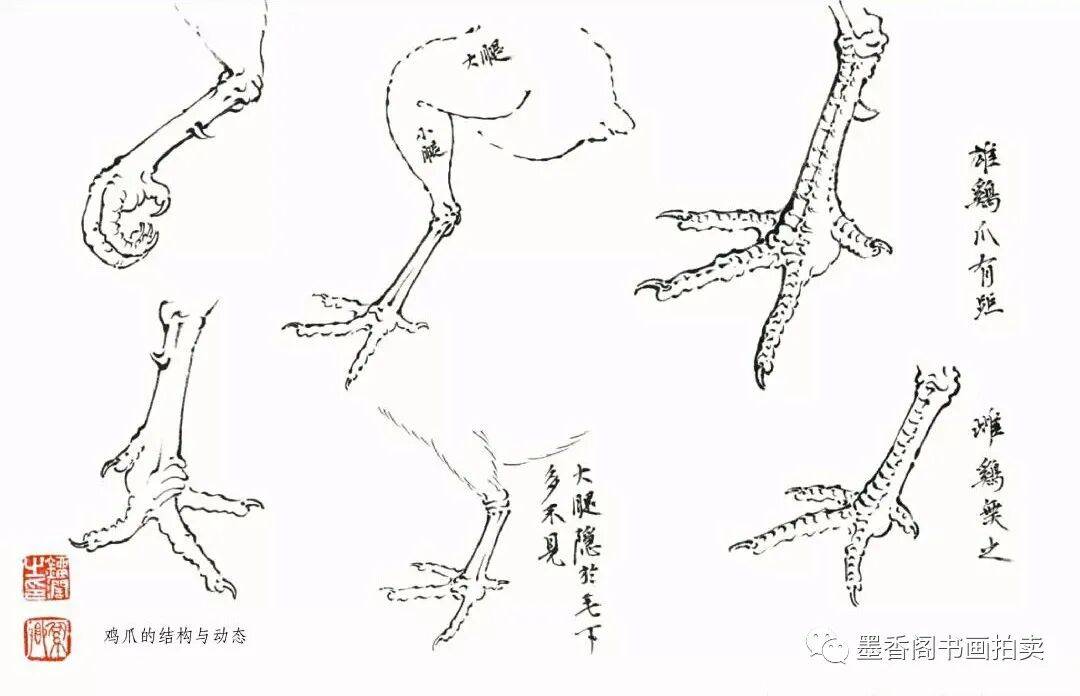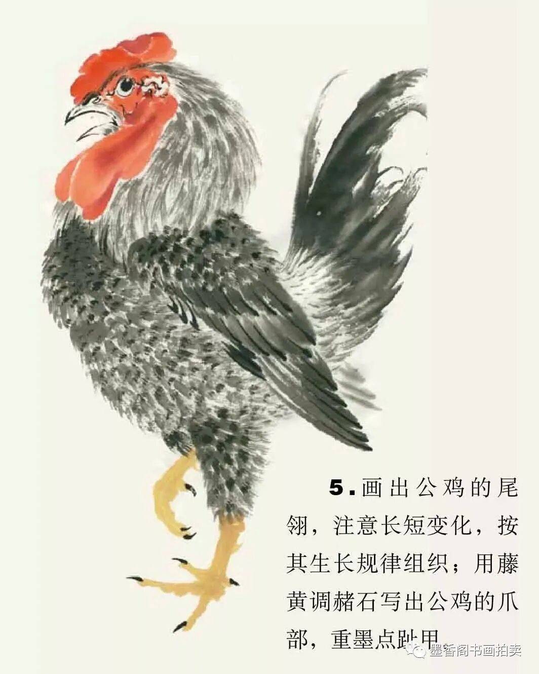 5.画出公鸡的尾翎,注意长短变化,按其生长规律组织,用藤黄调赭石写出公鸡的爪部,重墨点趾甲。