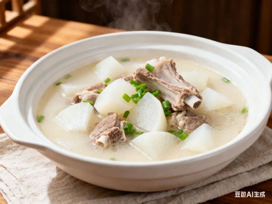 萝卜排骨汤不仅味道鲜美,还能加速消化,集养胃暖身于一体。制作时将猪肋排焯水后与白萝卜块一起炖煮,软烂后调味即可。