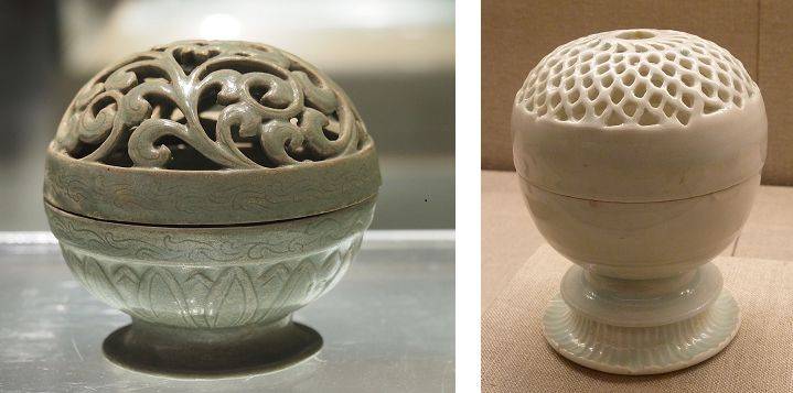 带盖子的一类,称熏炉,如香毬,如鸭炉和鸳鸯炉。材质则以瓷器为多,也有金银器。