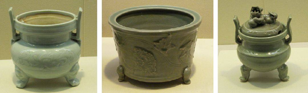 景德镇窑青白瓷刻花炉(出自新安海底沉船) 龙泉窑奁式炉(出自新安海底沉船)龙泉窑狮钮盖炉(出自新安海底沉船)图源作者