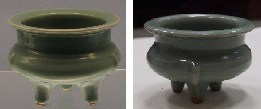 南宋龙泉窑梅子青鬲式炉(上海博物馆藏) 南宋龙泉窑粉青鬲式炉(南宋吴奥墓出土)图源作者