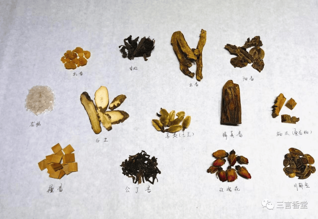 其一,构成主体香韵的基本香料,如水沉,白檀香,降真香。其二,用作调和与修饰的一类,如甘松,丁香,藿香,零陵香。其三,用作发香和聚香的一类,如艾纳,甲香,龙脑,乳香,安息香或金颜香,麝香,龙涎香。