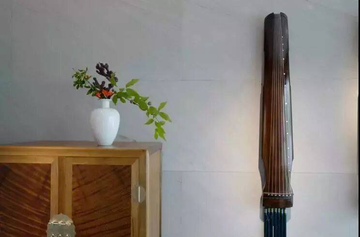 墙壁上挂古琴一把,中间放长条木几一张,墙上挂画一幅。