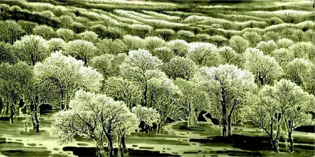 《长白林海》、《清净无染》、《家园》、《桃花雨》等作品都蔓延着这一风格,那海底珊瑚般神秘繁盛的山林无不透着绝尘脱俗的静美。我觉得,这一组都是最能体现关山雨个人风格的山水画作。