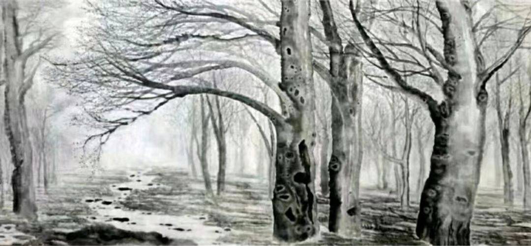 如果说《气节》属于小写意,那么《秋》则完全是白描了。洁白的天空下,仍是四株白杨挺然直立,站在最前面的树粗壮雄伟,虬枝伸张,质重如铁;右边的一棵则略细,再向后只露出一段笔直的小杨树干,也是铁青的颜色;最左边的树稍远,枝桠以淡墨勾勒,伸向远处。每棵树全都不着一叶,直指人心,充满张力,让人想起茅盾先生的《白杨礼赞》。
