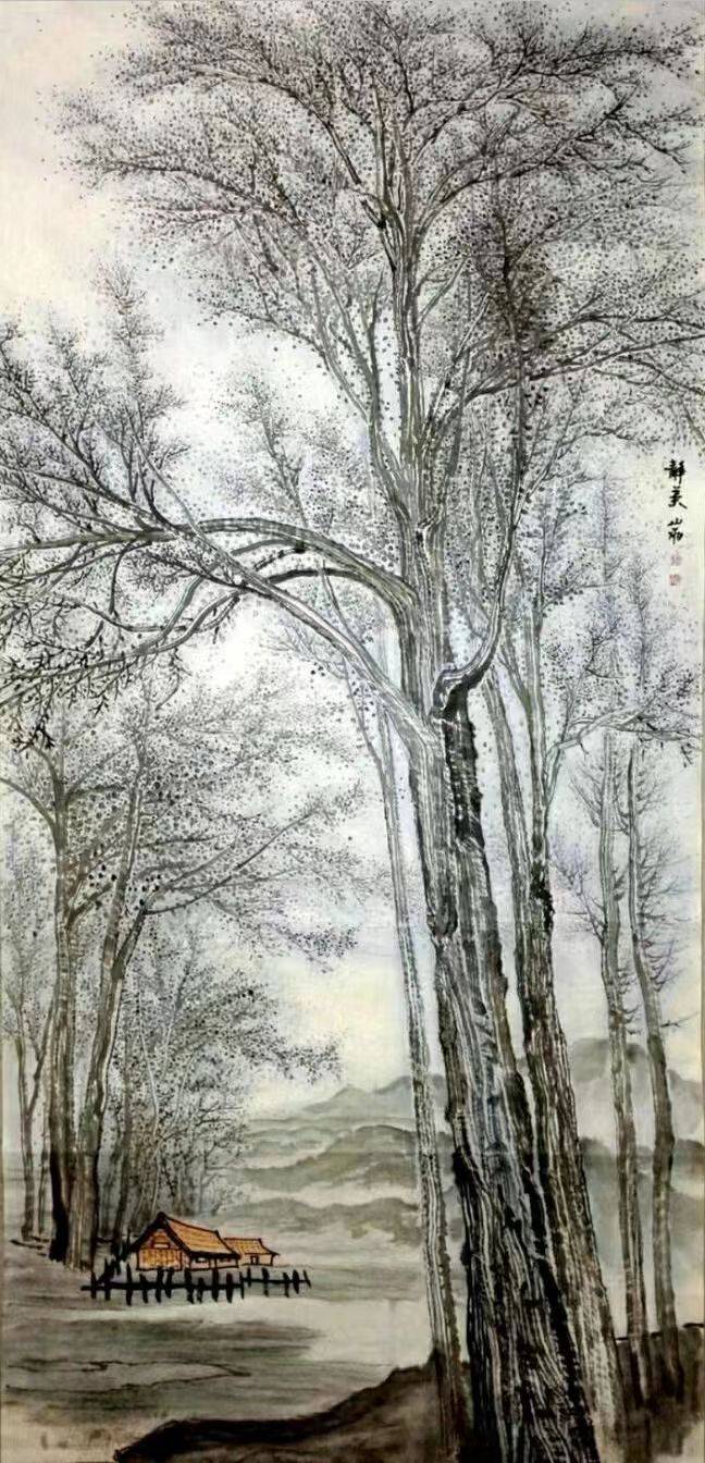 沈从文先生说:一切作品都需要有个性,都必须浸透作者的人格和感情。我想,这句话不独适于文学创作,用于画事,亦是相宜的。关山雨是一名土生土长的东北女性。她说她所在的东北土地广袤,平实质朴,却处处动人。林海雪原,白山黑水,都是她最熟悉的家乡侧影。即便如今生活的石油之都大庆,虽无山川的雄壮,却有苍茫林海,连绵碧湖,也是林水相依的美丽城市。这些大概都是滋养她心灵的艺术源泉。加之她情感丰沛,天性温和,资质颖慧,才气过人,又志清节高,淡泊无争,超越纷扰的世事,她将满腔热情都付于山水,才会有这些让人眼前一亮的翰墨丹青罢。透过这些笔墨,我们能一眼看到她深心的平和,她骨子里的善良,以及她天性里的温暖与闲静。