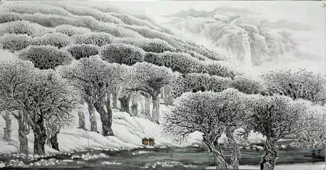 国画讲究留白,而关山雨的密林山水却铺满画面,那些墨点,那些线条,尽管那么密,但又绝无一点拖沓杂乱与繁冗,像音乐里的旋律一般有着她自已的节奏和韵味。她的《峥嵘岁月》,美得让人不由得屏住呼吸:一汪清寂的湖水静静地流着,有的地方似乎结了冰,白石头一样的冰块峥峥地露出水面,却挡不住灰蓝色的湖水静静流淌的步子。雪落在水里,就化了,像墨在水里淡淡地洇开了。此岸立着三棵树,其中两棵依偎着,与另一棵树默默相对,枝枝桠桠却在空中亲密地交织起来,托起一片轻盈的洁白;彼岸是洁白的山坡,长满大片大片的密林,一样的树,一样的枝枝桠桠,一样密不透风地交织着,将寂静与洁白层层铺向天边。画面的右上角是一片淡淡的远山,层峦叠嶂,一条飞瀑从天际奔腾而下,白如练,流如注,整个画面充满了黑白的交响,令山林静寂,湖水澄明,灵魂安然。天地万物都缄默无语,唯有落在雪岸边的两只橙红色的小鸟,相依着,悄悄私语,给这清寂的世界平添一点深刻的暖。这样的山水密林,充满了文学的意象之美。只看一眼,就让我无比震撼,浮躁的心仿佛一瞬间就平静下来。是不是所有的世事,最后都会像这片雪林,平寂,洁白,静美?