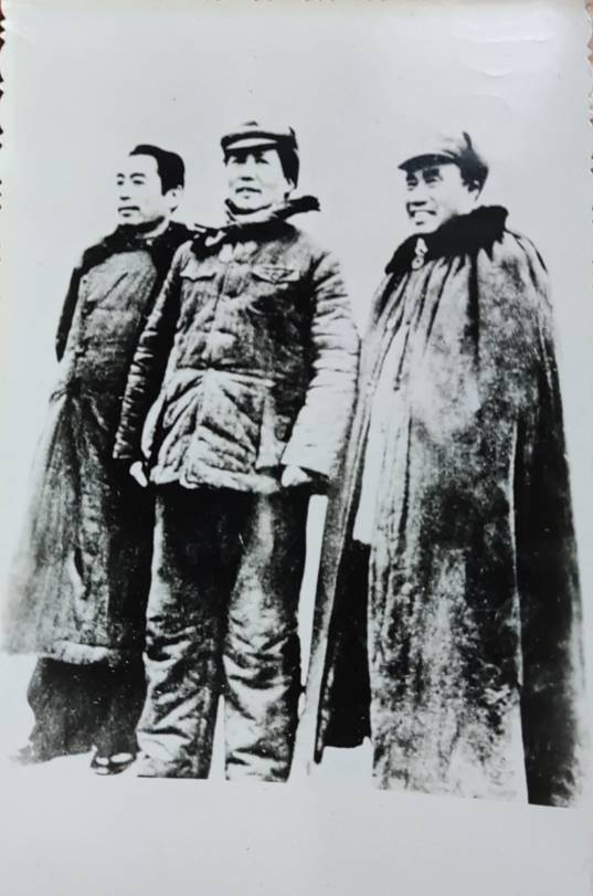 这张照片中,毛主席、朱德和周恩来三人站在一起,展现了他们之间深厚的革命友谊。