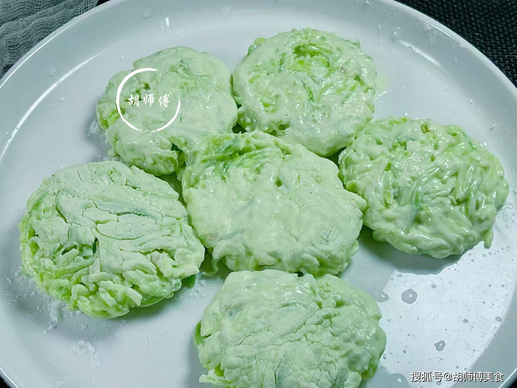 第四步:将搅拌的青萝卜丝捏成小面团后,再把它按压成饼状,接着再把青萝卜丝饼放入淀粉中滚一圈,一定要滚一圈面粉,这样可以使青萝卜丝表面的淀粉成型,不会稀释成水。