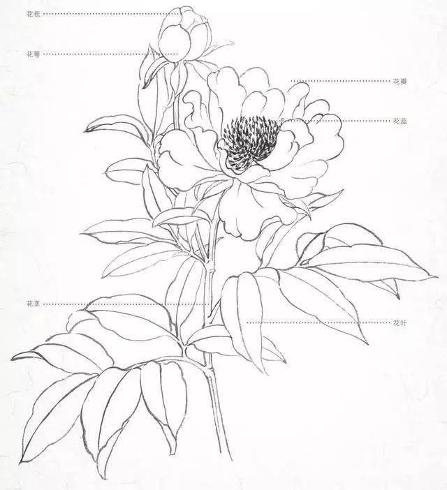 线描中最具代表性的是铁线描类,其压力均匀,粗细无变化。此类描法适于勾勒物象的轮廓,如花瓣、叶子等一些流畅性较好的轮廓。此类技法线条墨色秀润简劲,细劲平直,根据不同的质感则使用不同的表现手法来体现外柔内刚的特征。