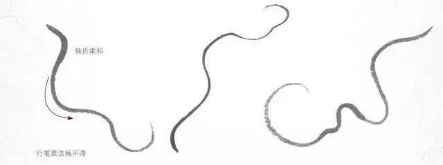 此描法是中锋运笔,笔法如行云流水,活跃飞动,有起有倒。