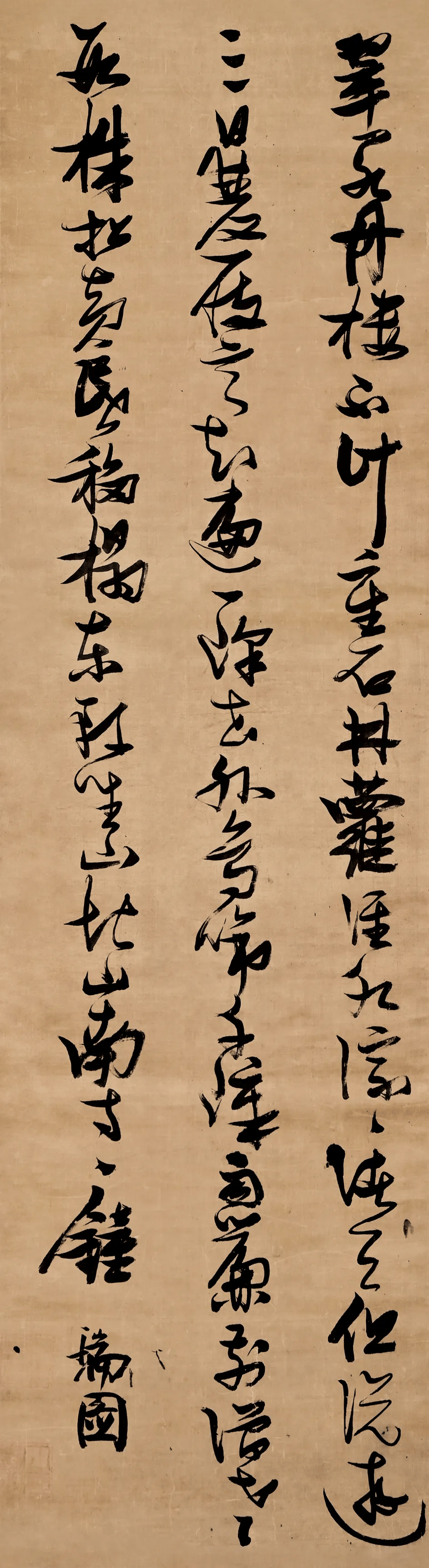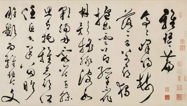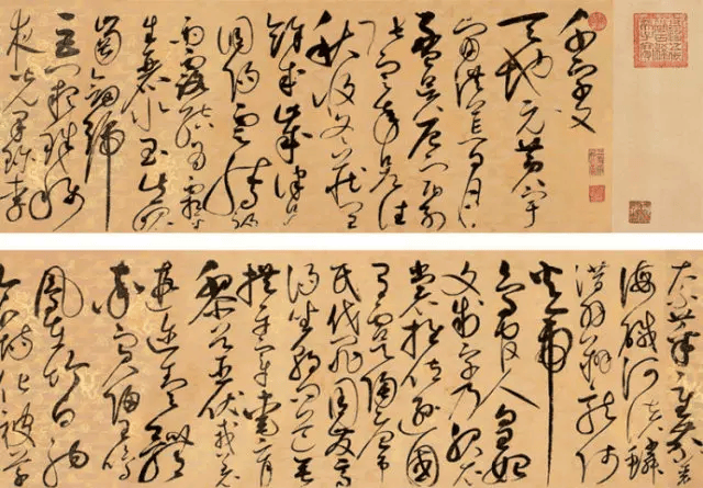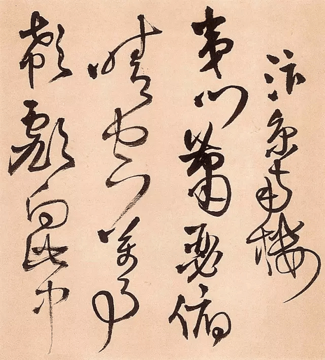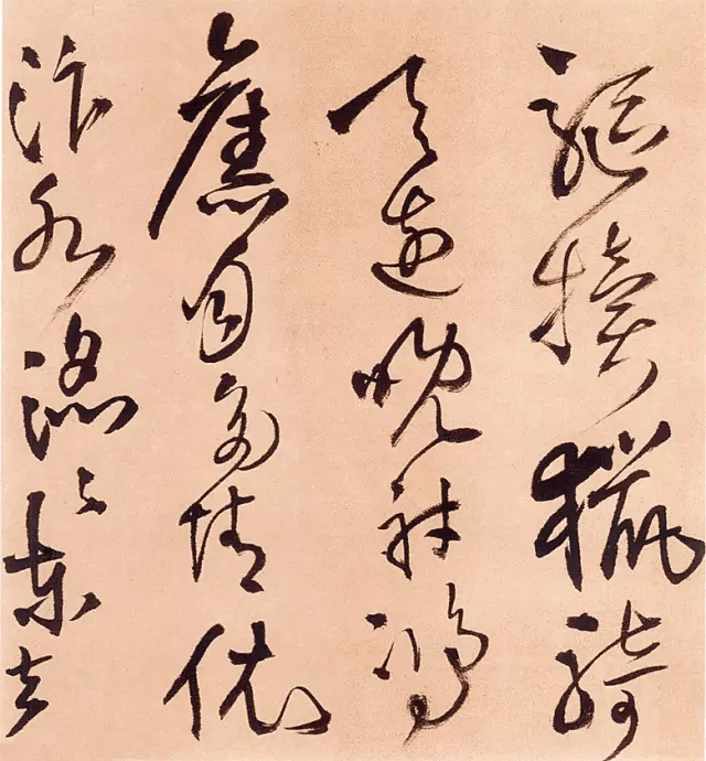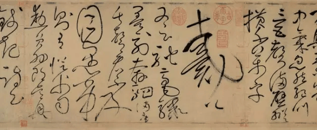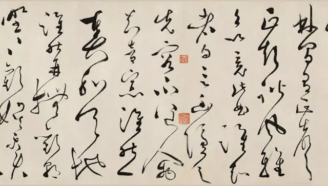 这幅狂草常见或两三字、或五六字、甚至整行连串为一组。字的单体结构被打破了,几个字或整行联属组成一个新的整体。