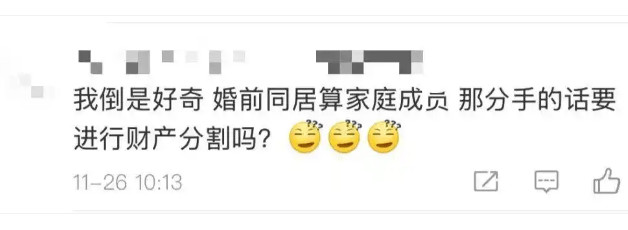 有网友提出疑问,如婚前同居属于家庭成员,那情侣如果分手,是不是要分割财产啊?