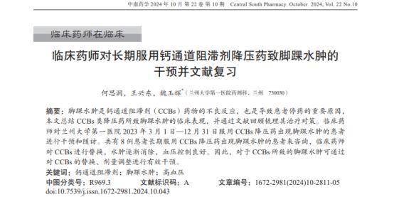 [1]何思润,临床药师对长期服用钙通道阻滞剂降压药致脚踝水肿的干预并文献复习,2024-10-16