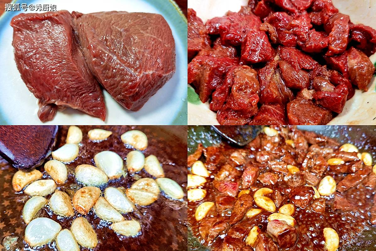 1. 牛里脊或牛腿肉切成小粒,用生抽、料酒、一点点淀粉和食用油抓匀,腌15分钟。