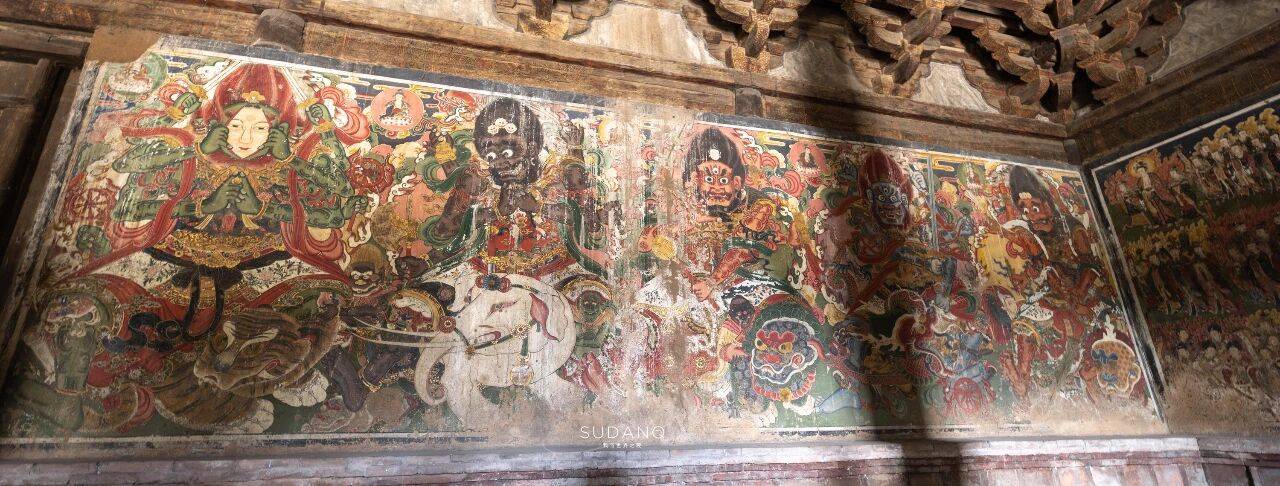 大殿的北壁是密宗大明王彩绘;东壁上层绘有日、月、星等天界诸神,中层是天干地支与二十八星宿,下层则是帝王将相、儒生隐士组成的人间群像;