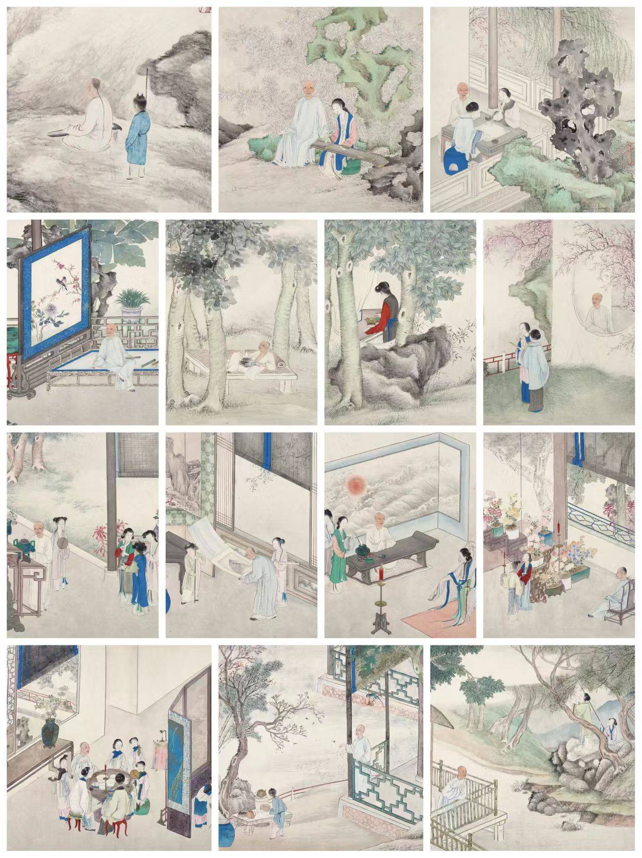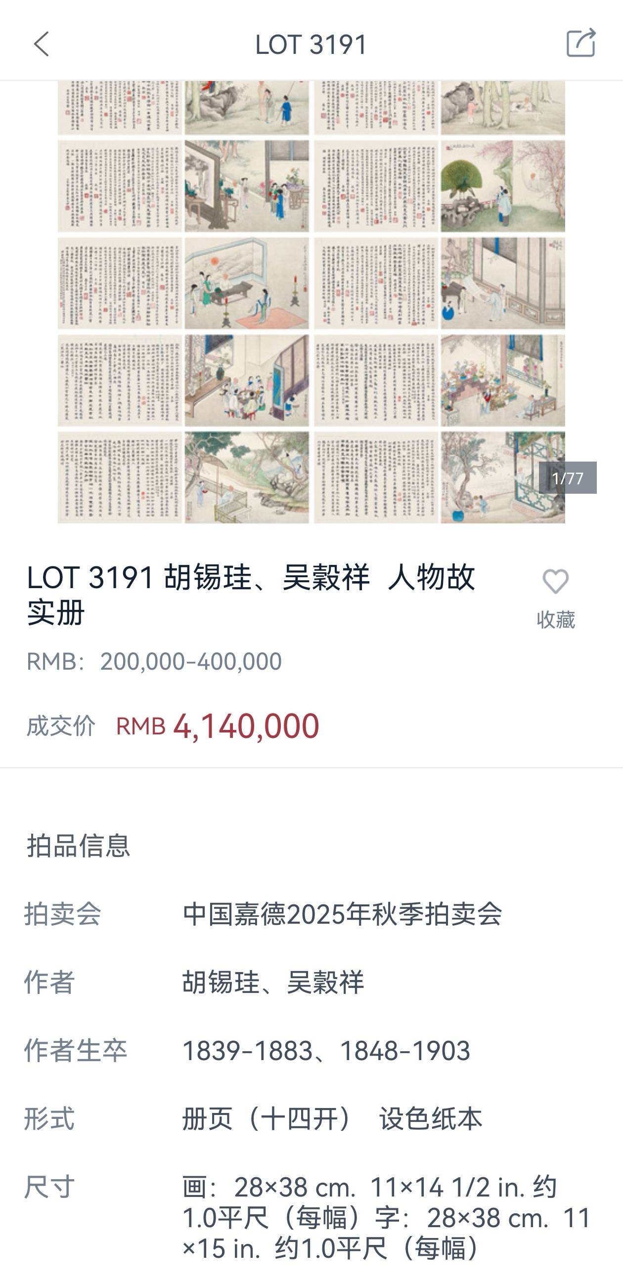 胡锡珪吴穀祥二人绘制的《人物故实册》十四开,成交414万,破了两人的最高成交记录。这个价格不仅是对画作本身的肯定,更是市场对清代精品文人画价值的高度认可,作品画透了古代文人的“精致生活指南”