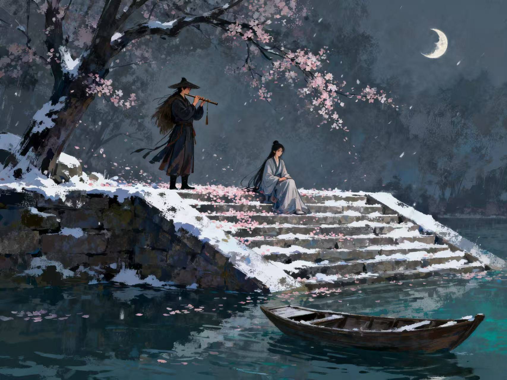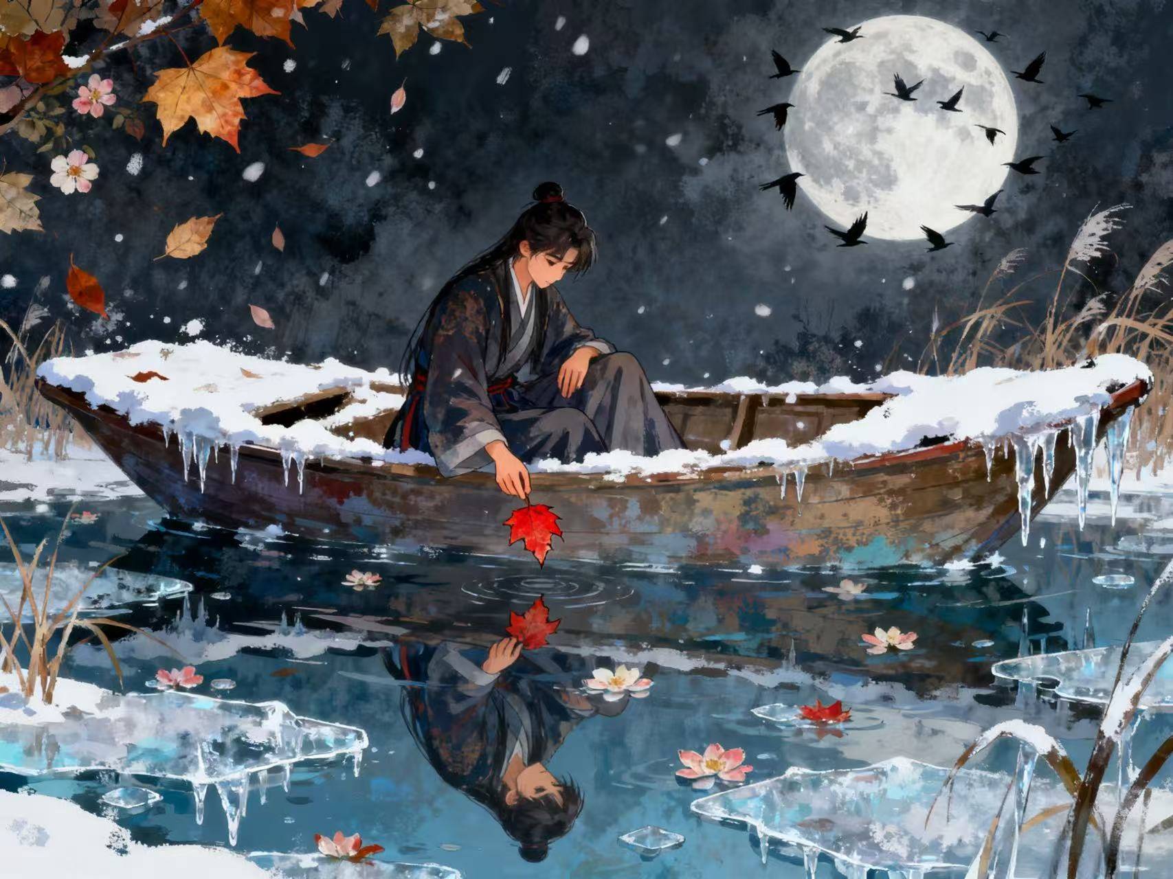 崔涂一生漂泊,屡试不第,常年辗转于吴楚、巴蜀之间,羁旅之愁是他诗词的底色。除夕之夜,家家户户团圆守岁,他却独自客居他乡,寒灯相伴。窗外霜雪漫天,他望着天边月色,想起故乡的亲人此刻定也在思念千里之外的自己;抚摸鬓边新增的白发,才惊觉又是一年过去,功名未就,归期难料。这份愁绪,不是撕心裂肺的悲恸,而是如霜雪般的寒凉,浸透着对故乡的眷恋、对年华的惋惜、对命运的无奈。“思千里” 是空间的阻隔,“又一年” 是时光的流逝,两句诗将羁旅之人的孤独与怅惘写得入木三分,道尽了乱世中游子的辛酸。