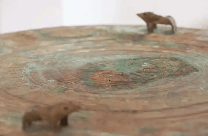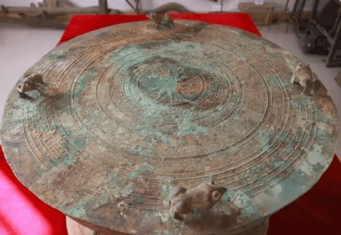 鼓面上的太阳纹依然清晰,仿佛还在散发着两千年前的光热;