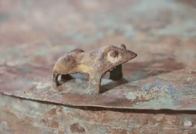太阳纹路如涟漪般荡漾开来,四只青铜青蛙静卧鼓边,
