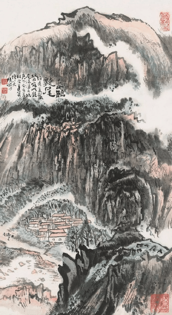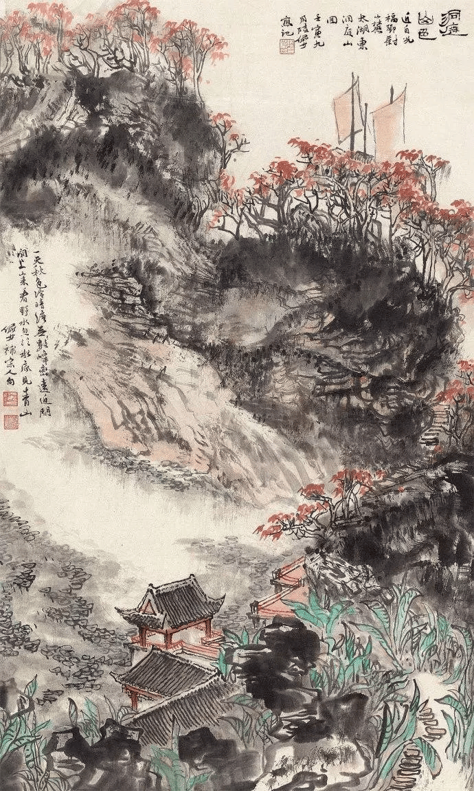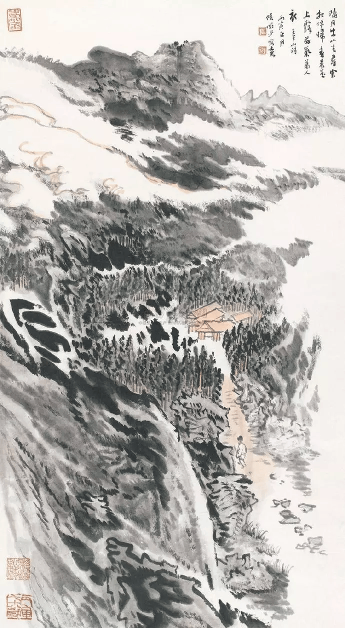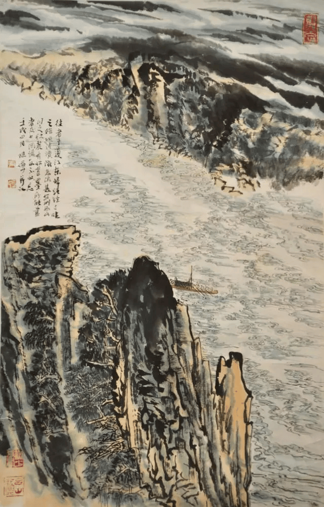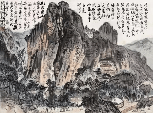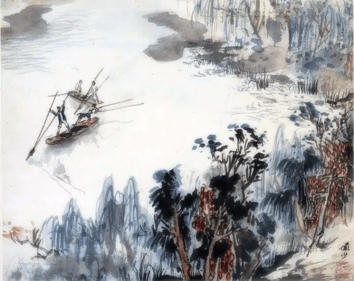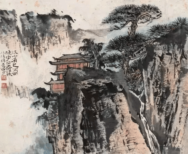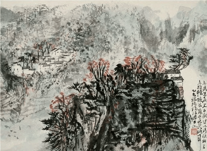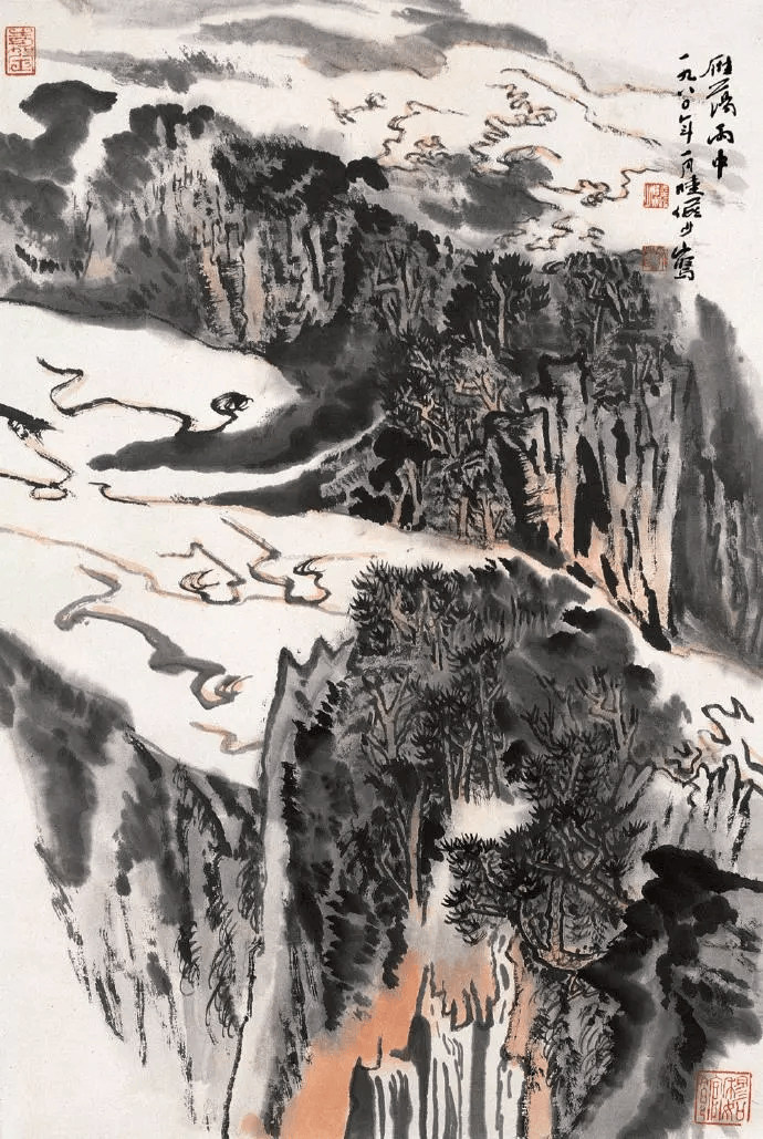 陆俨少是海上画派的重要代表人物,他的笔墨层次丰富,气韵生动,线条变化流动,意境卓绝。他曾说:画云水,用笔要流畅飞动,和山石在笔墨上形成尖锐的对比,使动者益动,静者益静。独特的云水法、留白法, 多变的章法取势, 将诗、书、画放于并重的地位, 并能很好地将其融合在一起。他在深入师法传统的基础上通过大量的写生与体验生活, 在自然的观察学习中敢于创立新法, 给传统山水画带来新的笔墨语言, 但并非拘泥于某一家某一派, 也并没有传统文人画家那种崇南抑北的思想, 继而确立了其山水画独特的艺术面目, 形成了极具个性的“陆家山水”。